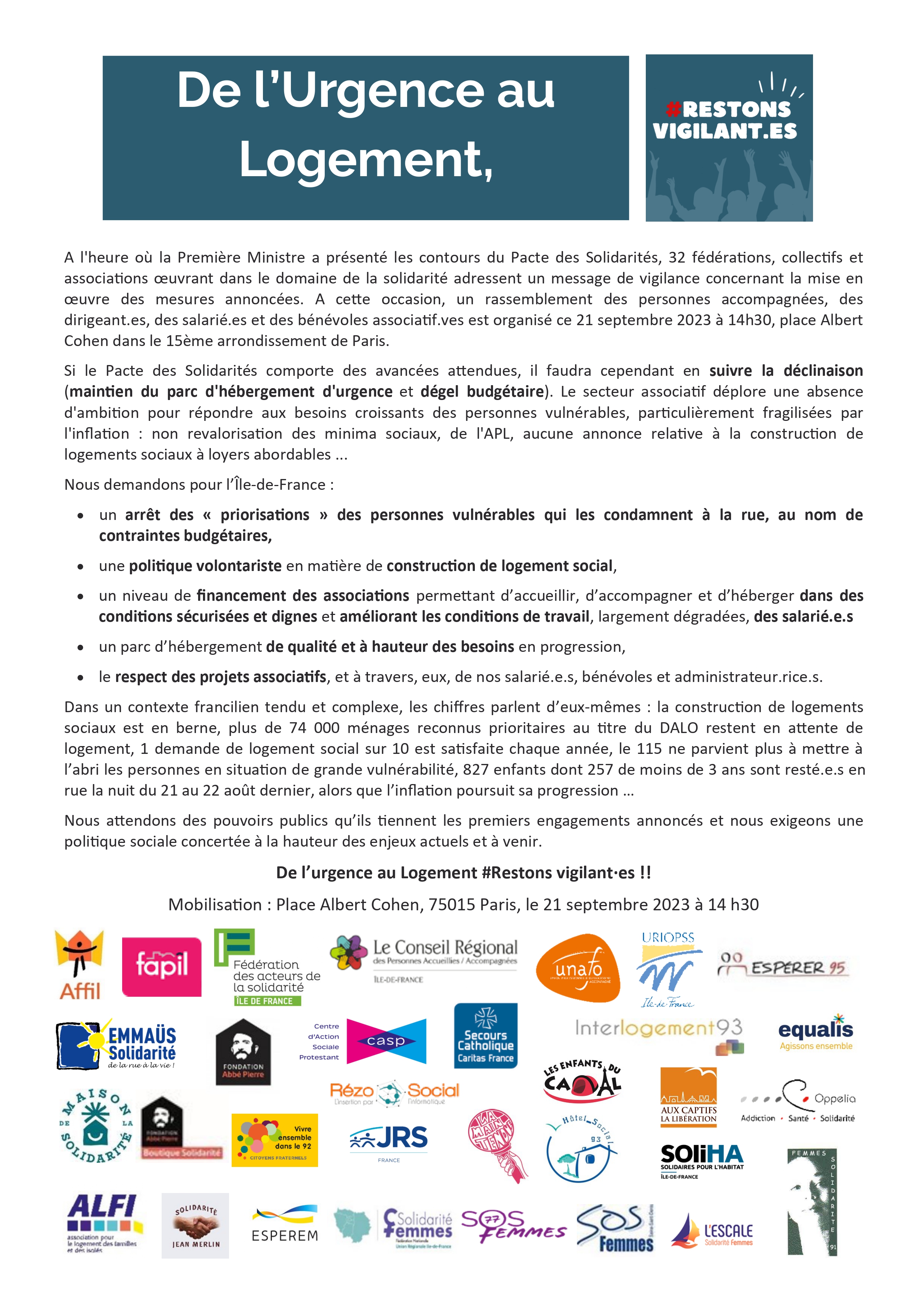 Devant la crise du logement et de l'hébergement qui s'accentue de manière très inquiétante en Ile-de-France, le Collectif Citoyens Fraternels 92 a co-signé le communiqué de presse initié par la FAS IDF sur le rassemblement du 21/09 « De l’Urgence au Logement #Restons vigilant·es !! ».