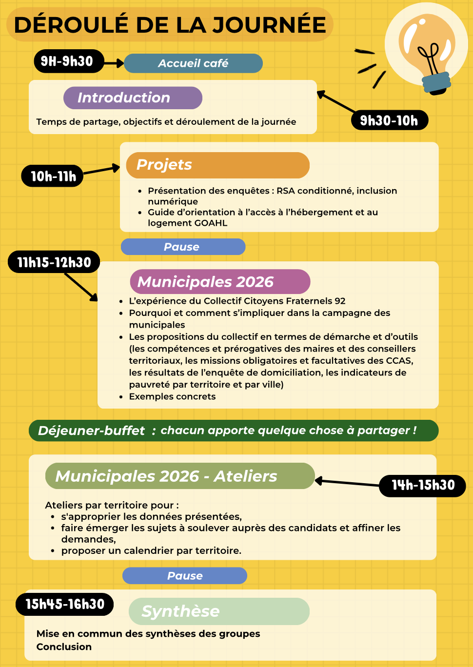 À travers des temps d’échange, des présentations de projets, des ateliers territoriaux et une réflexion collective, nous chercherons à faire émerger des propositions concrètes à porter dans le cadre des élections municipales de 2026.