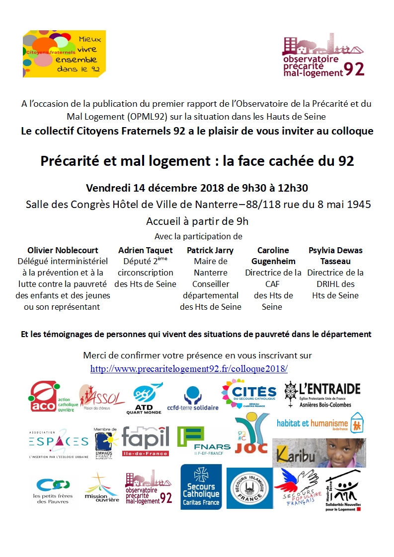 Le collectif Citoyens Fraternels 92 a le plaisir de vous inviter au colloque qu’il organise dans la salle des congrès de l’hôtel de ville de Nanterre, vendredi 14 décembre, de 9h30 à 12h30, à l’occasion de la publication du premier rapport de l’OPML 92* sur l’état de la pauvreté et du mal logement dans les Hauts-de-Seine. Inscription ici